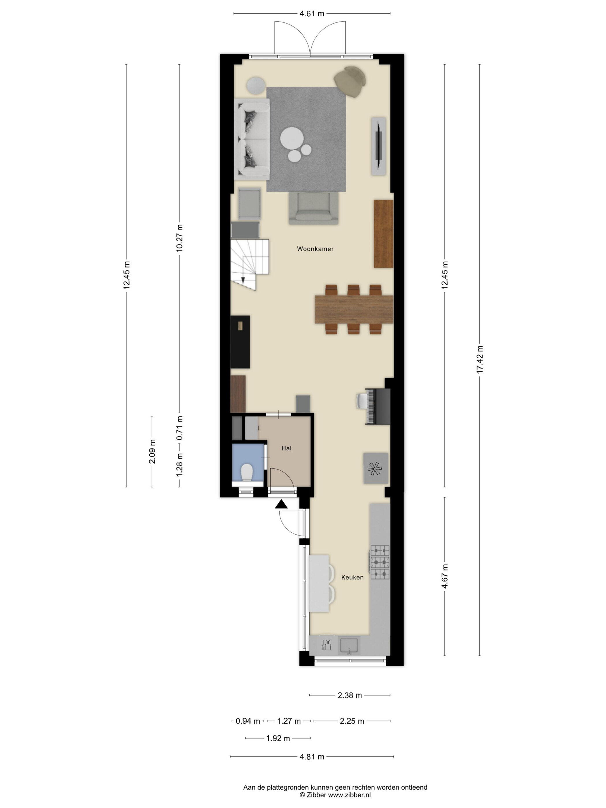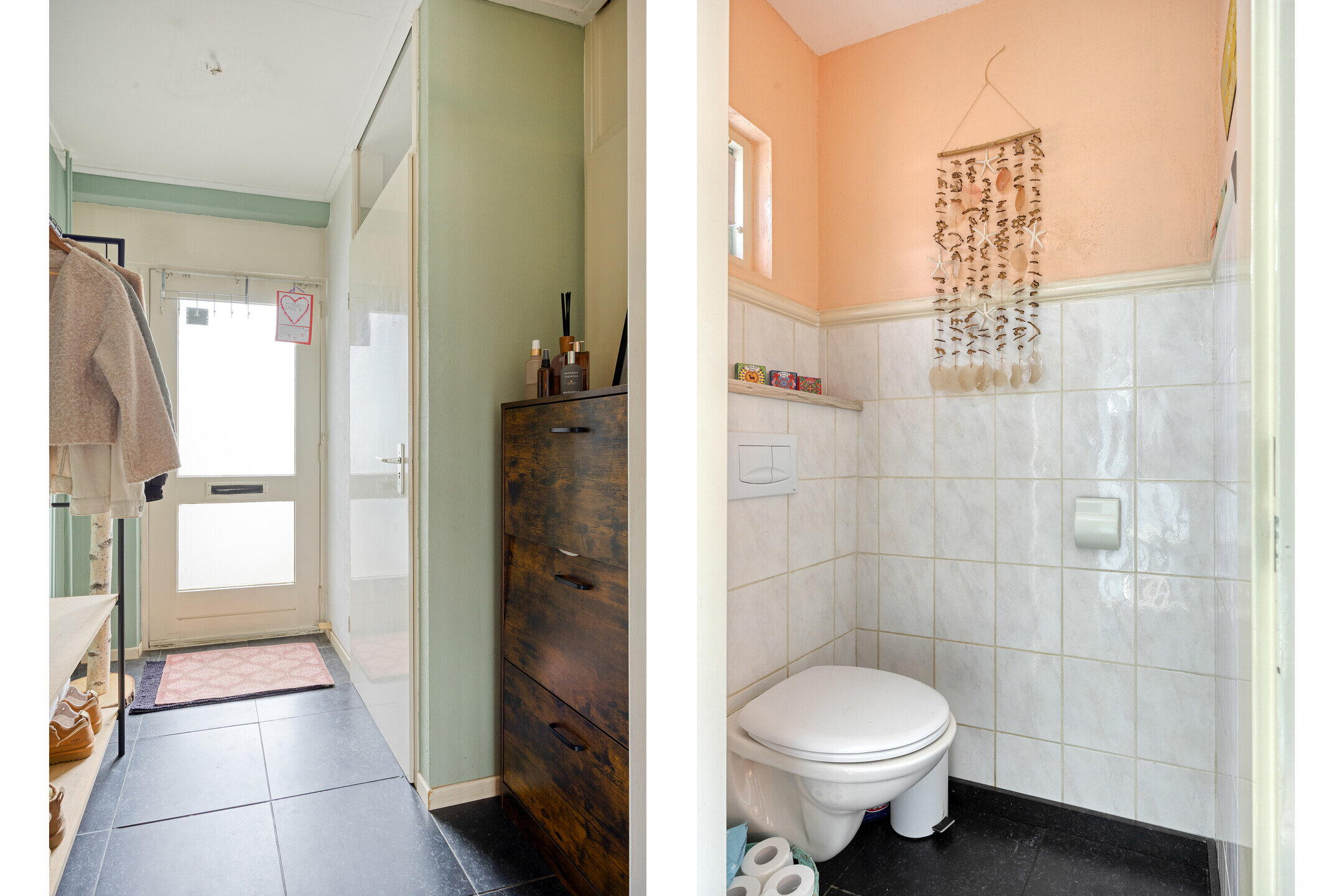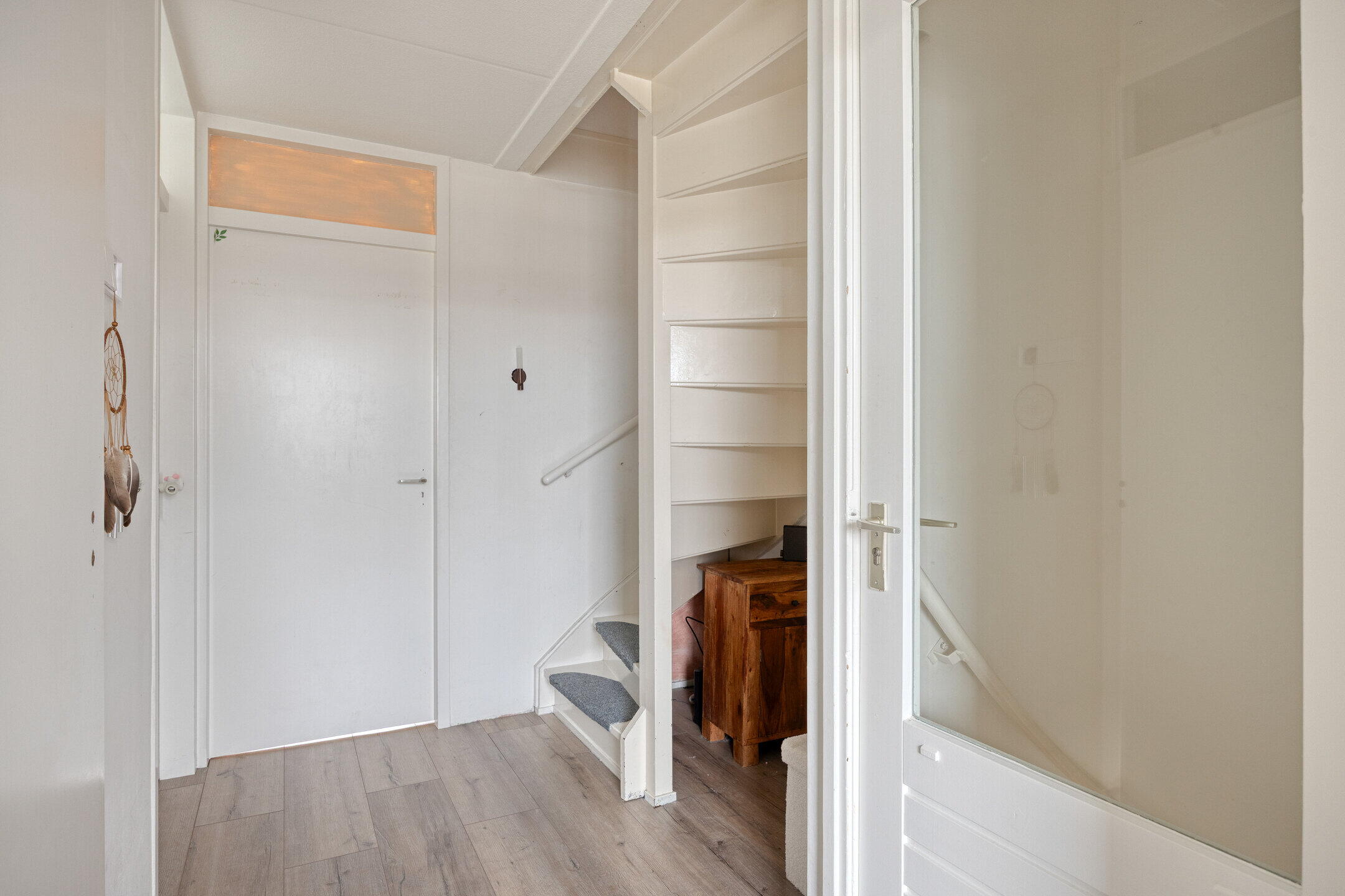 Je parkeert de auto gemakkelijk direct voor de woning, waarna je via de onderhoudsvriendelijke voortuin de woning betreedt. In de hal vind je het toilet en de doorgang naar de woonkamer, wat zorgt voor een nette en praktische binnenkomst.