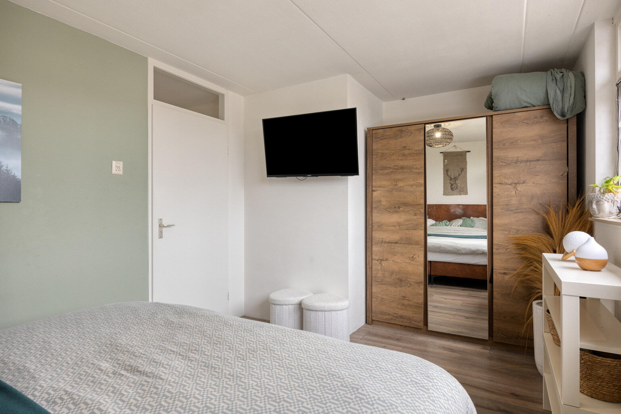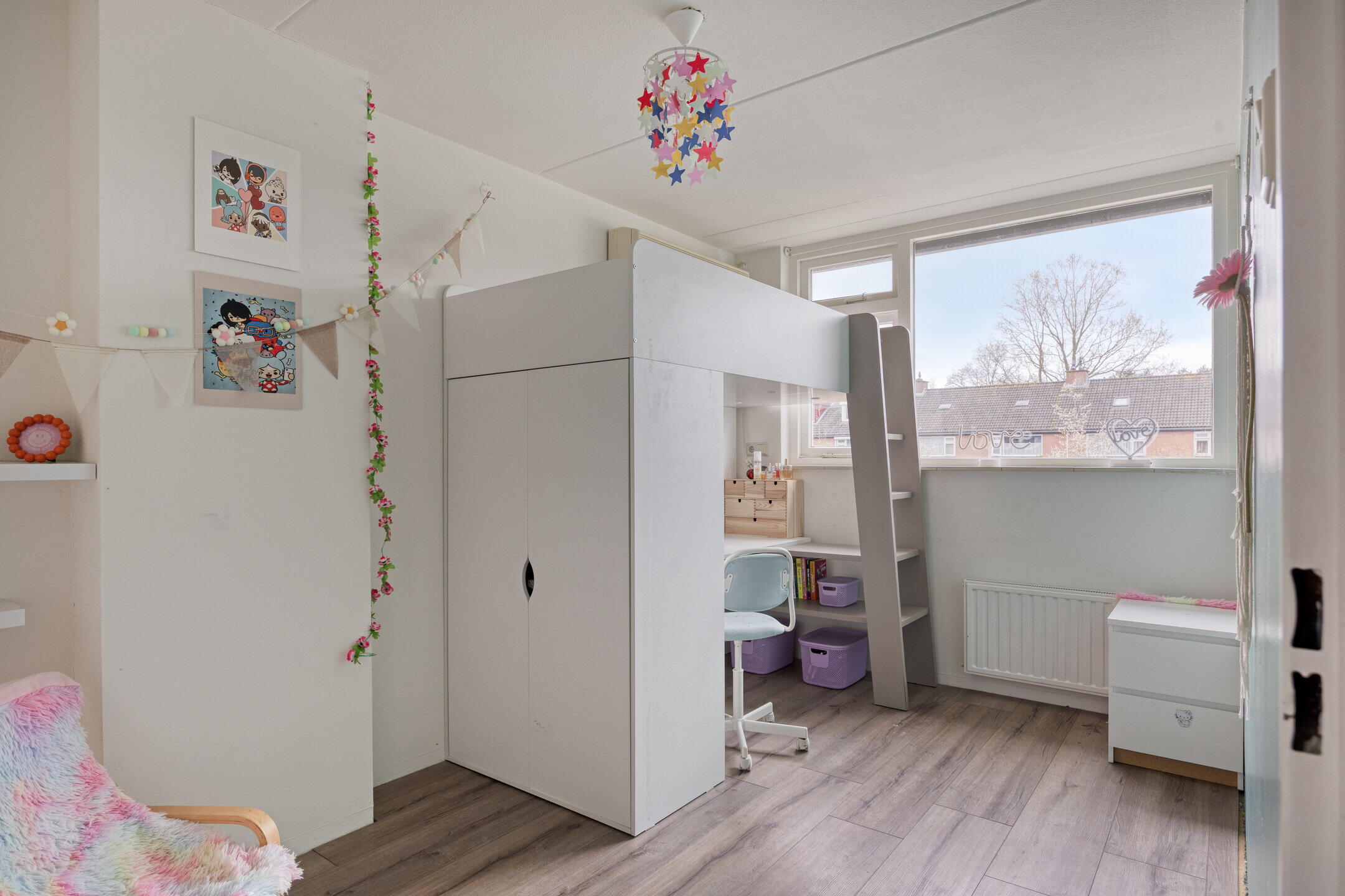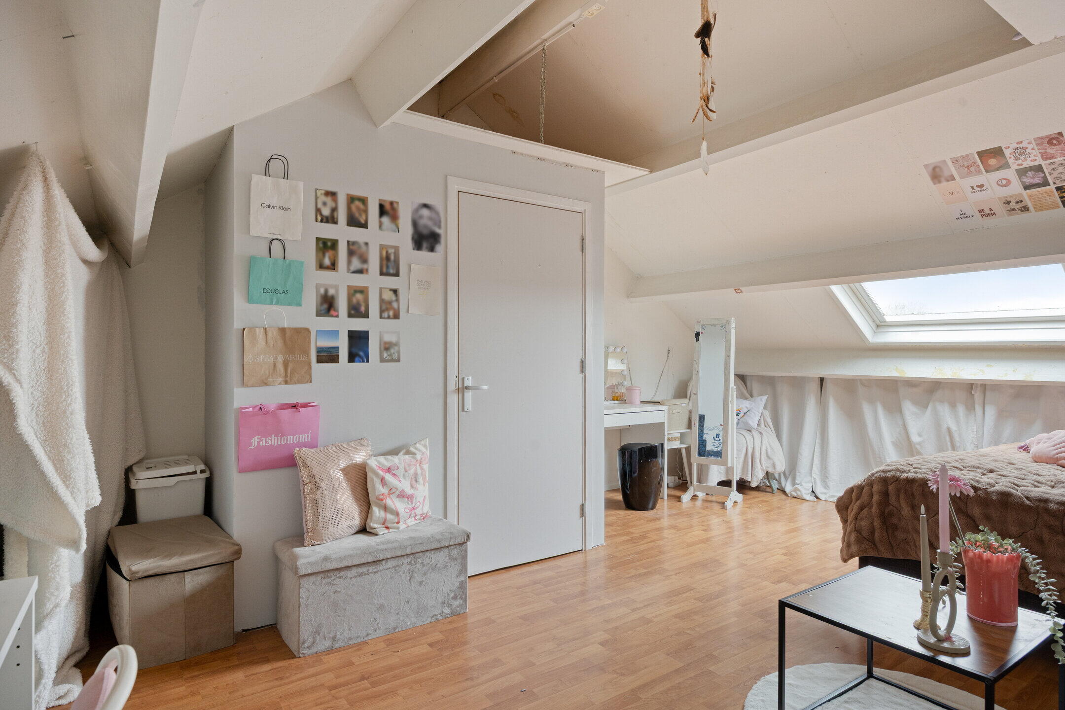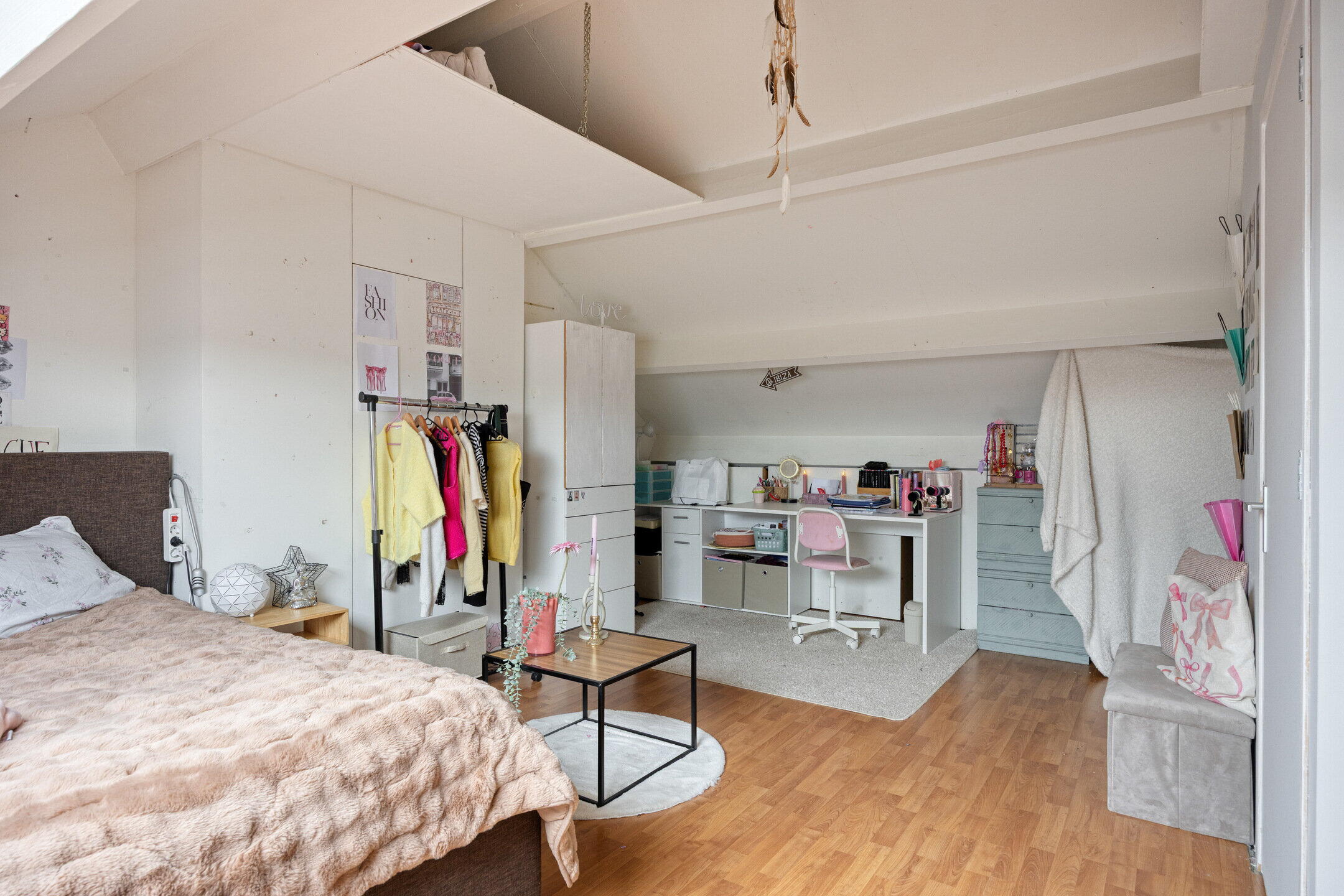 Op de eerste verdieping bevinden zich drie slaapkamers. De royale master bedroom ligt aan de achterzijde en beslaat de volledige breedte van de woning, met voldoende ruimte voor een tweepersoonsbed en een grote kledingkast. Aan de voorzijde liggen nog twee slaapkamers, ideaal als kinderkamer, werkkamer of logeerkamer. De badkamer heeft een moderne uitstraling met grijze betontegels en een stijlvol houten meubel. Hier vind je een toilet, wastafel met meubel en een ligbad met douchefunctie. De zolderverdieping verrast met een ruime vierde slaapkamer, voorzien van een dakraam en praktische bergruimte onder de schuine kanten. Ook bevinden zich hier de aansluitingen voor wasmachine en droger, wat deze verdieping extra functioneel maakt.
