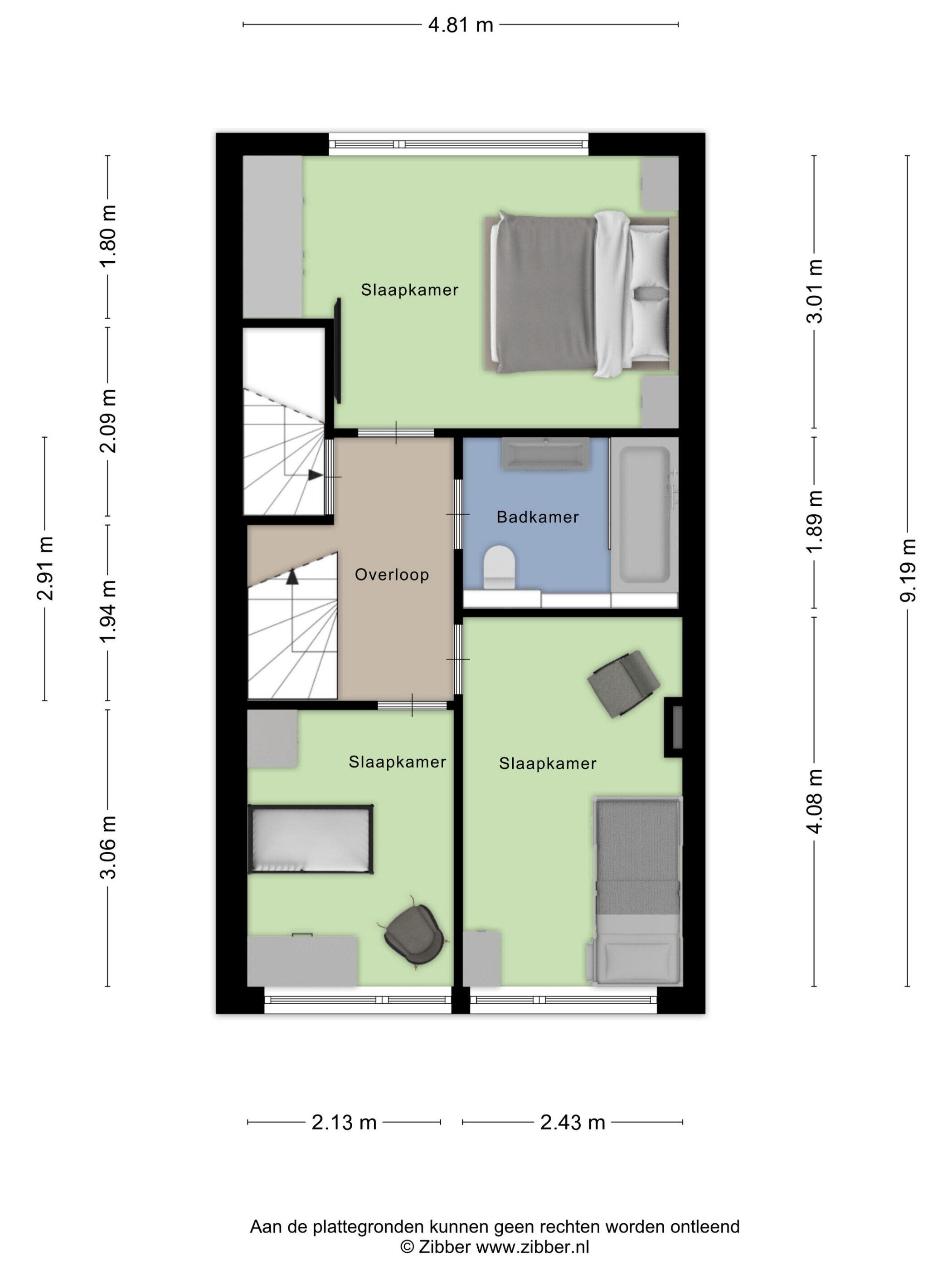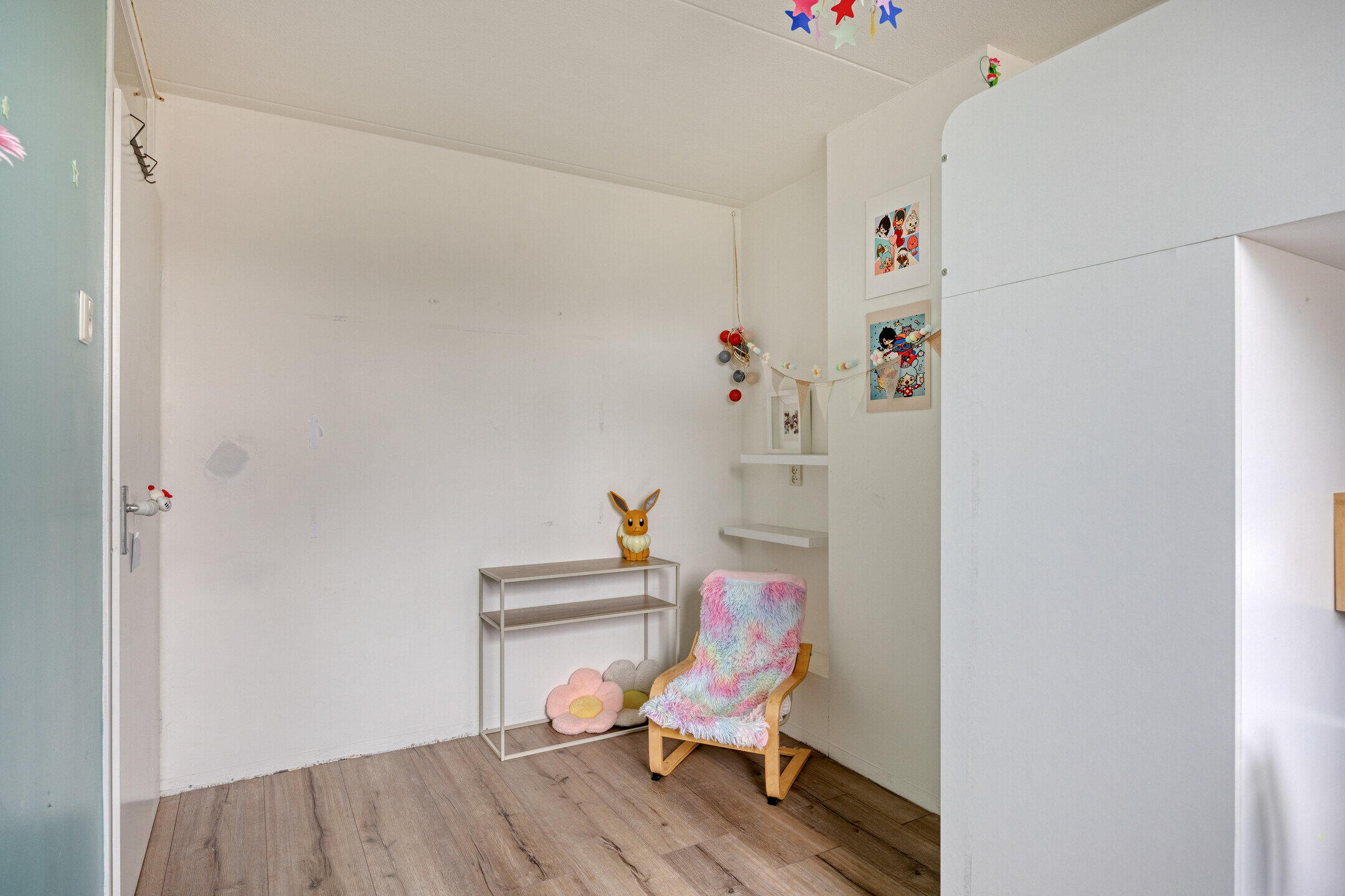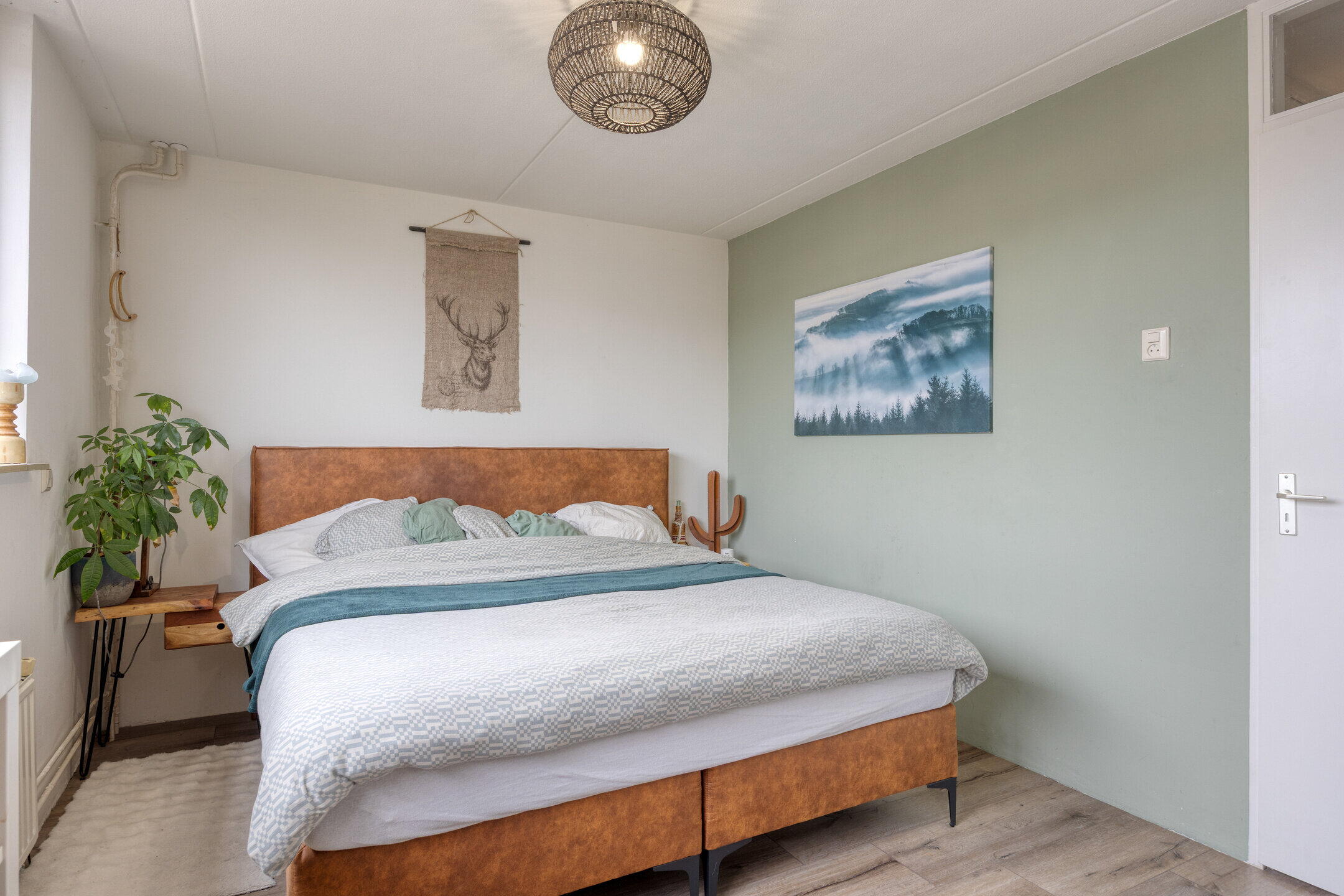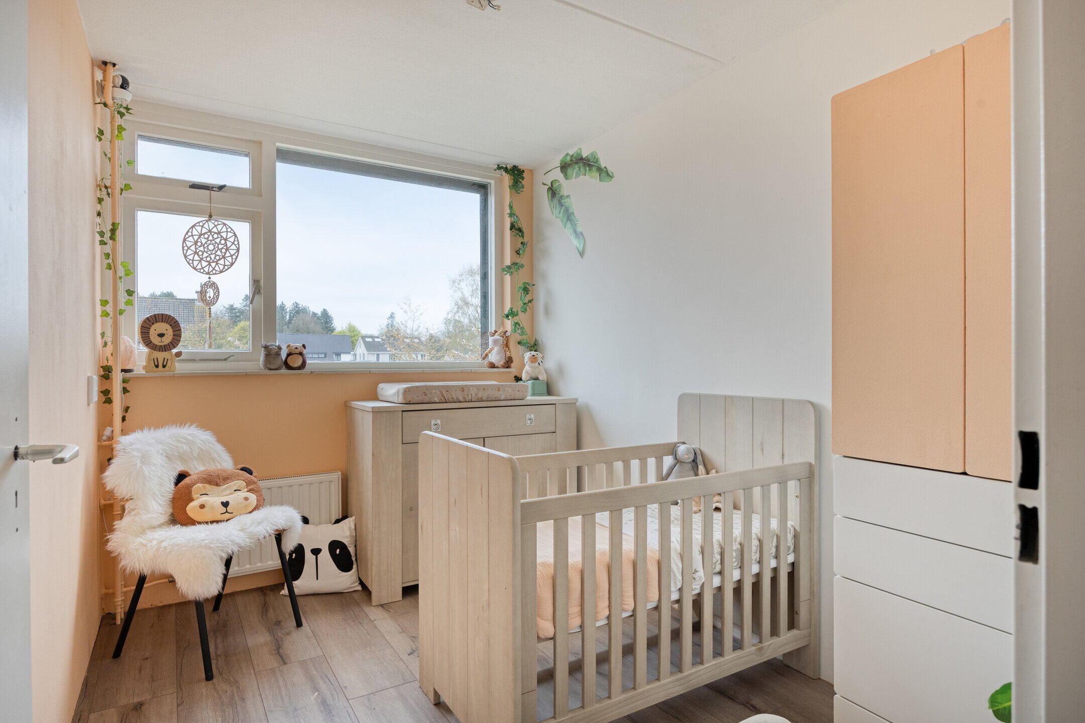 Op de eerste verdieping bevinden zich drie slaapkamers. De royale master bedroom ligt aan de achterzijde en beslaat de volledige breedte van de woning, met voldoende ruimte voor een tweepersoonsbed en een grote kledingkast. Aan de voorzijde liggen nog twee slaapkamers, ideaal als kinderkamer, werkkamer of logeerkamer. De badkamer heeft een moderne uitstraling met grijze betontegels en een stijlvol houten meubel. Hier vind je een toilet, wastafel met meubel en een ligbad met douchefunctie. De zolderverdieping verrast met een ruime vierde slaapkamer, voorzien van een dakraam en praktische bergruimte onder de schuine kanten. Ook bevinden zich hier de aansluitingen voor wasmachine en droger, wat deze verdieping extra functioneel maakt.