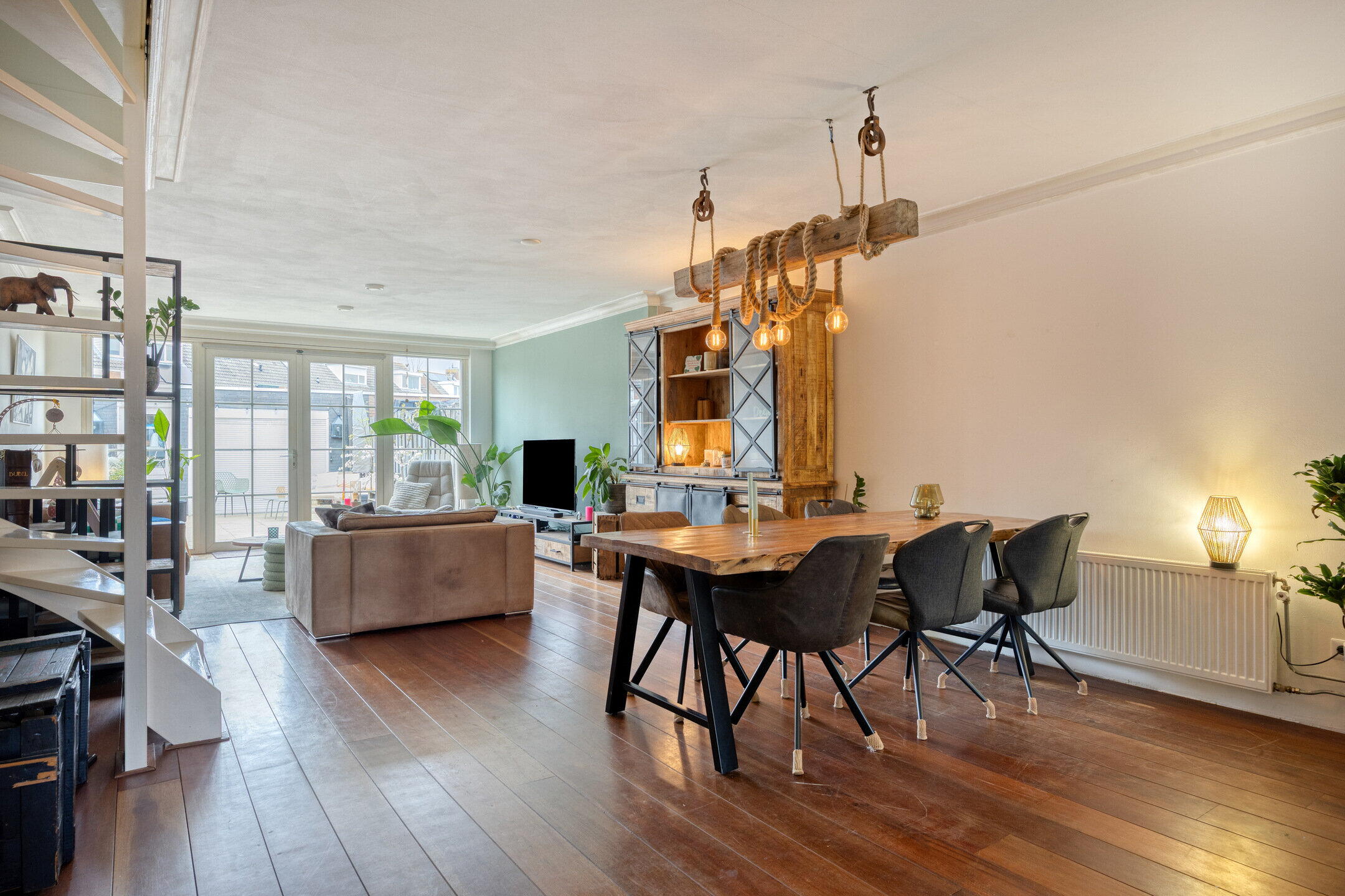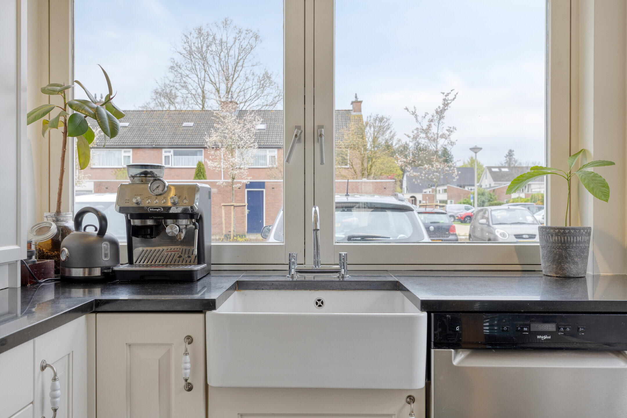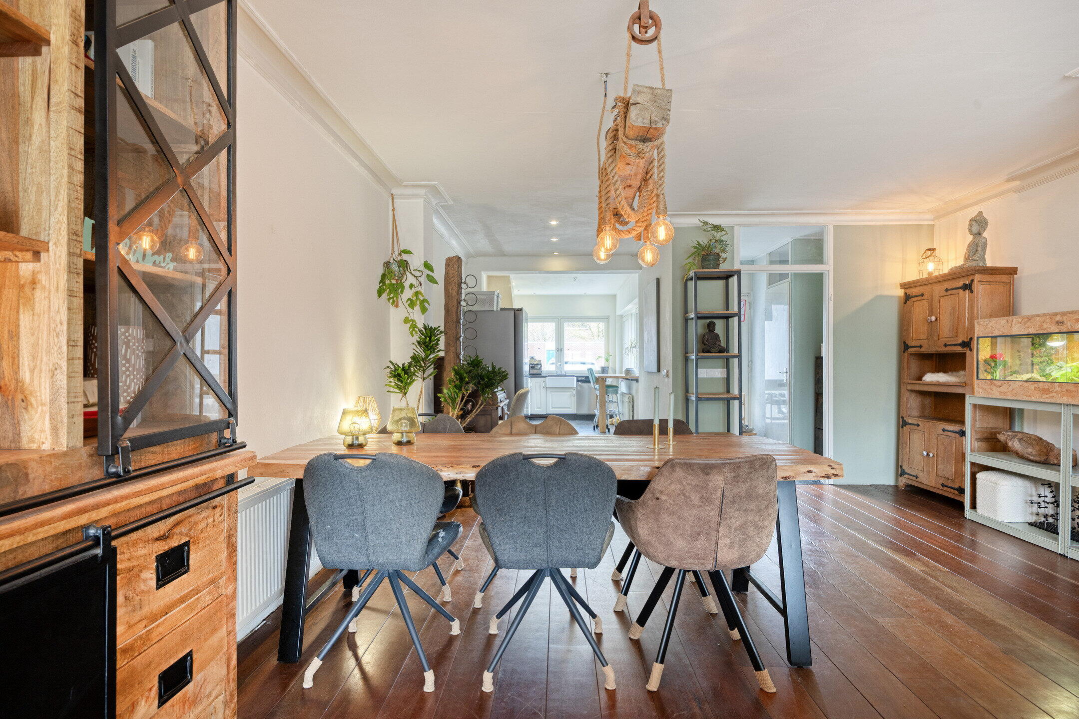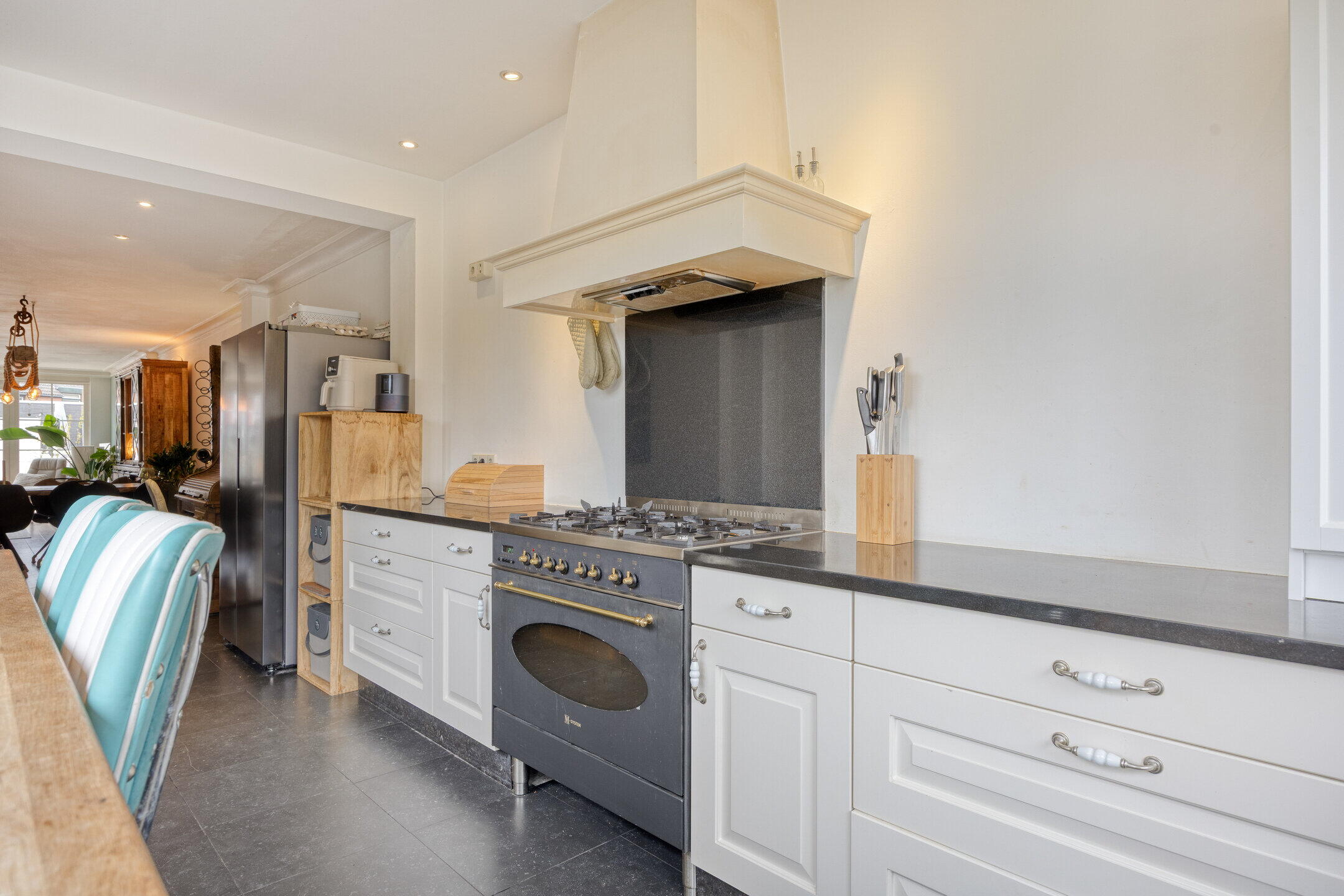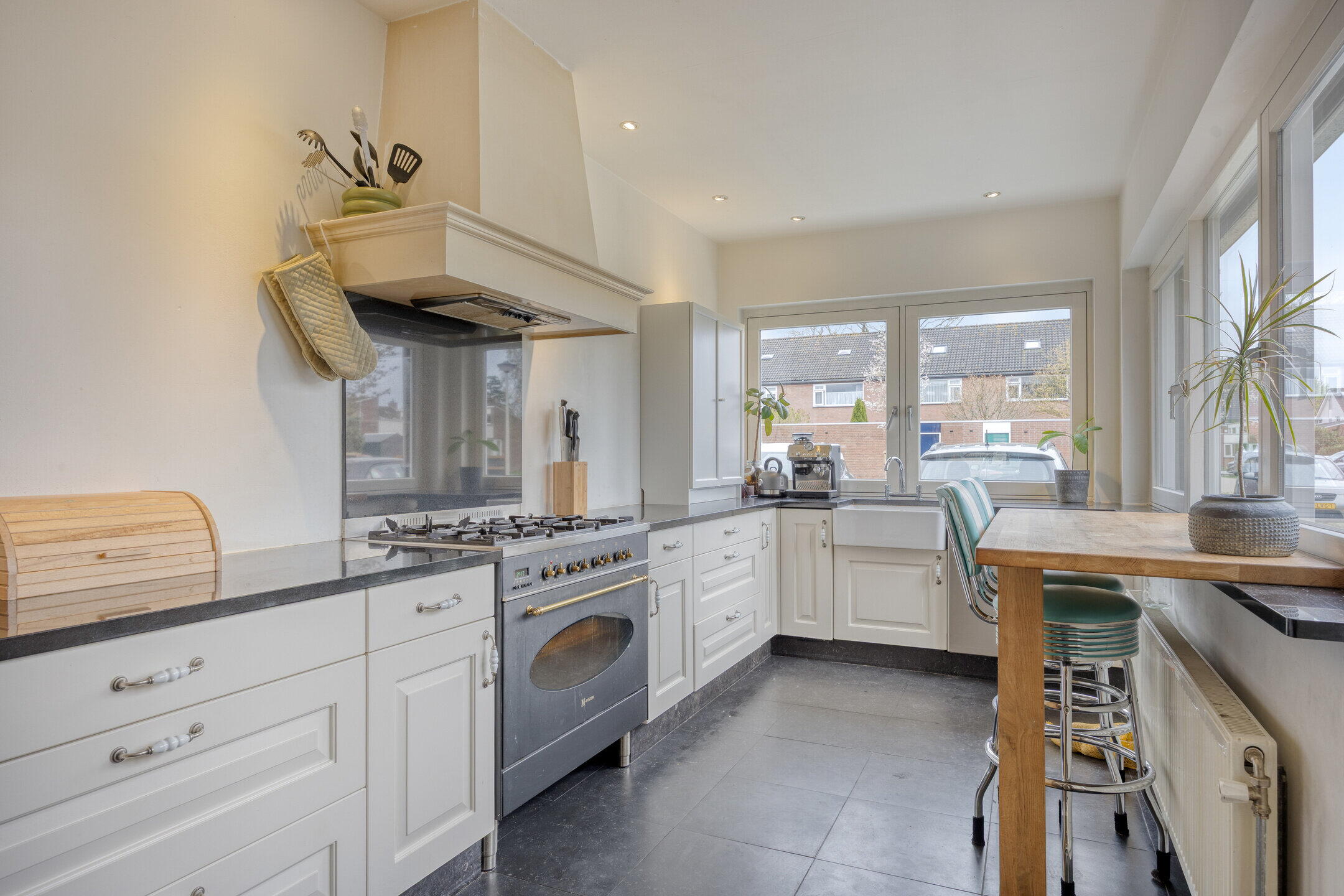 De woonkamer is heerlijk ruim en praktisch ingedeeld. Aan de achterzijde bevindt zich het zitgedeelte, waar de grote ramen en openslaande tuindeuren zorgen voor een open en aangename sfeer en een directe verbinding met de tuin. Er is volop ruimte voor een royale zithoek én kasten. Centraal in de woonkamer is plek voor een gezellige eettafel waar je met gemak met zes personen kunt tafelen. De trap naar de verdieping is speels geïntegreerd in de ruimte. Aan de voorzijde van de woning ligt de keuken in een charmante hoekopstelling met een landelijke uitstraling. De grote ramen geven de ruimte een prettige en ruimtelijke beleving. De keuken is voorzien van een fornuis, oven en vaatwasser. Extra leuk detail is het barretje aan de andere zijde van de muur, een perfecte plek voor een snelle kop koffie of een gezellig ontbijt.
