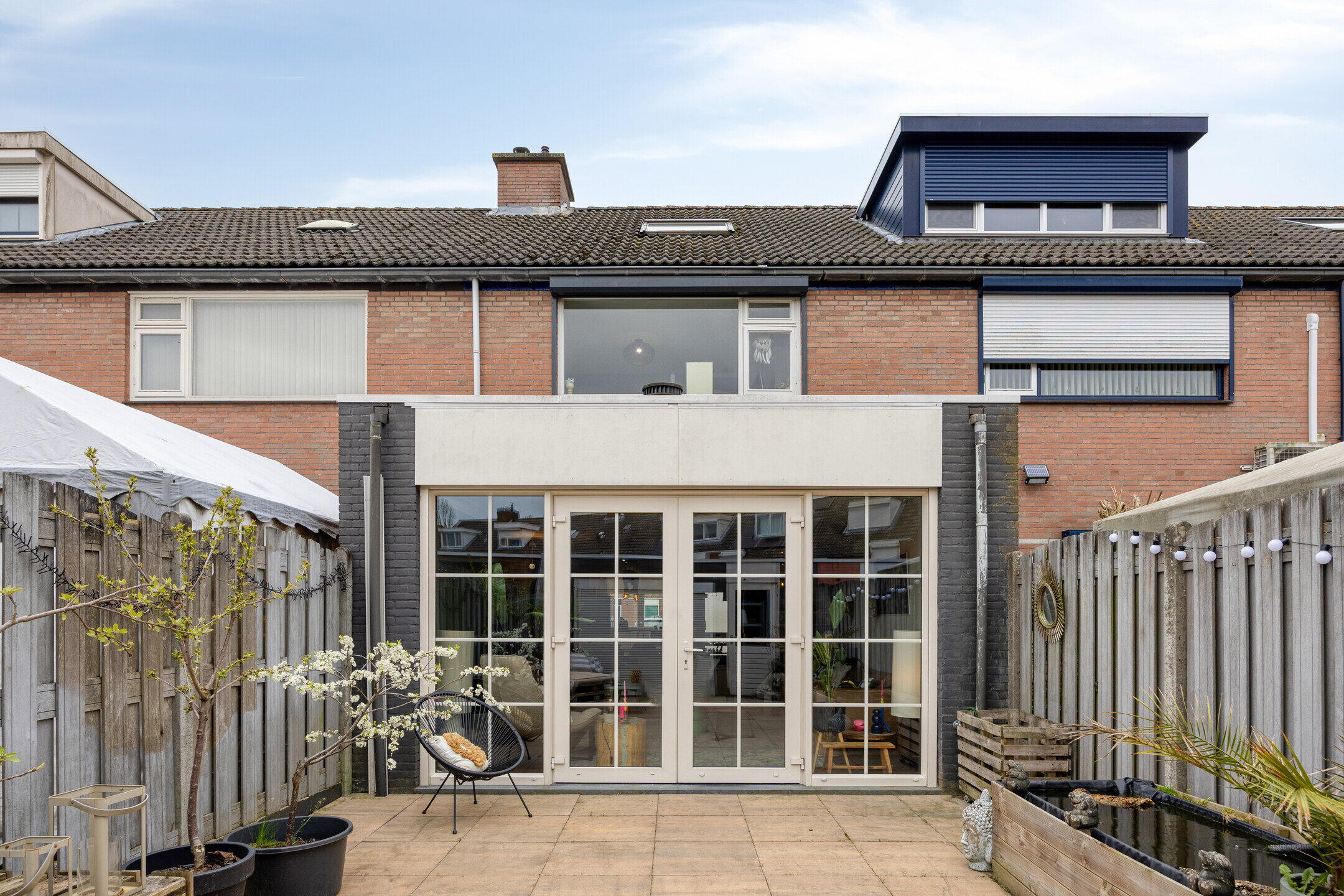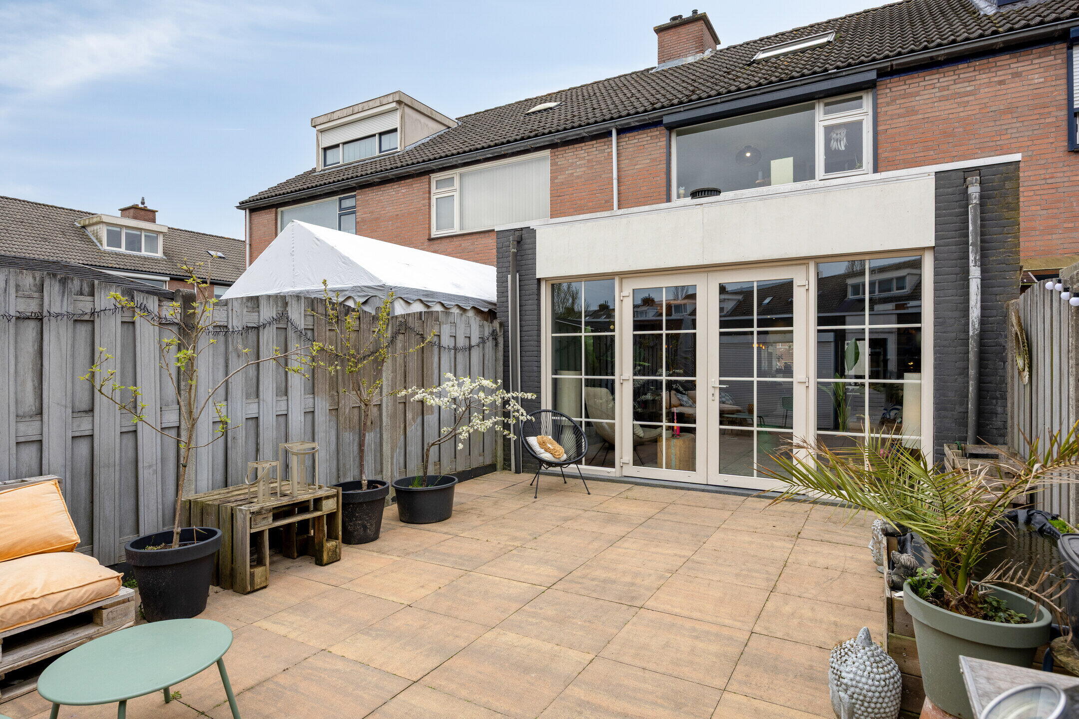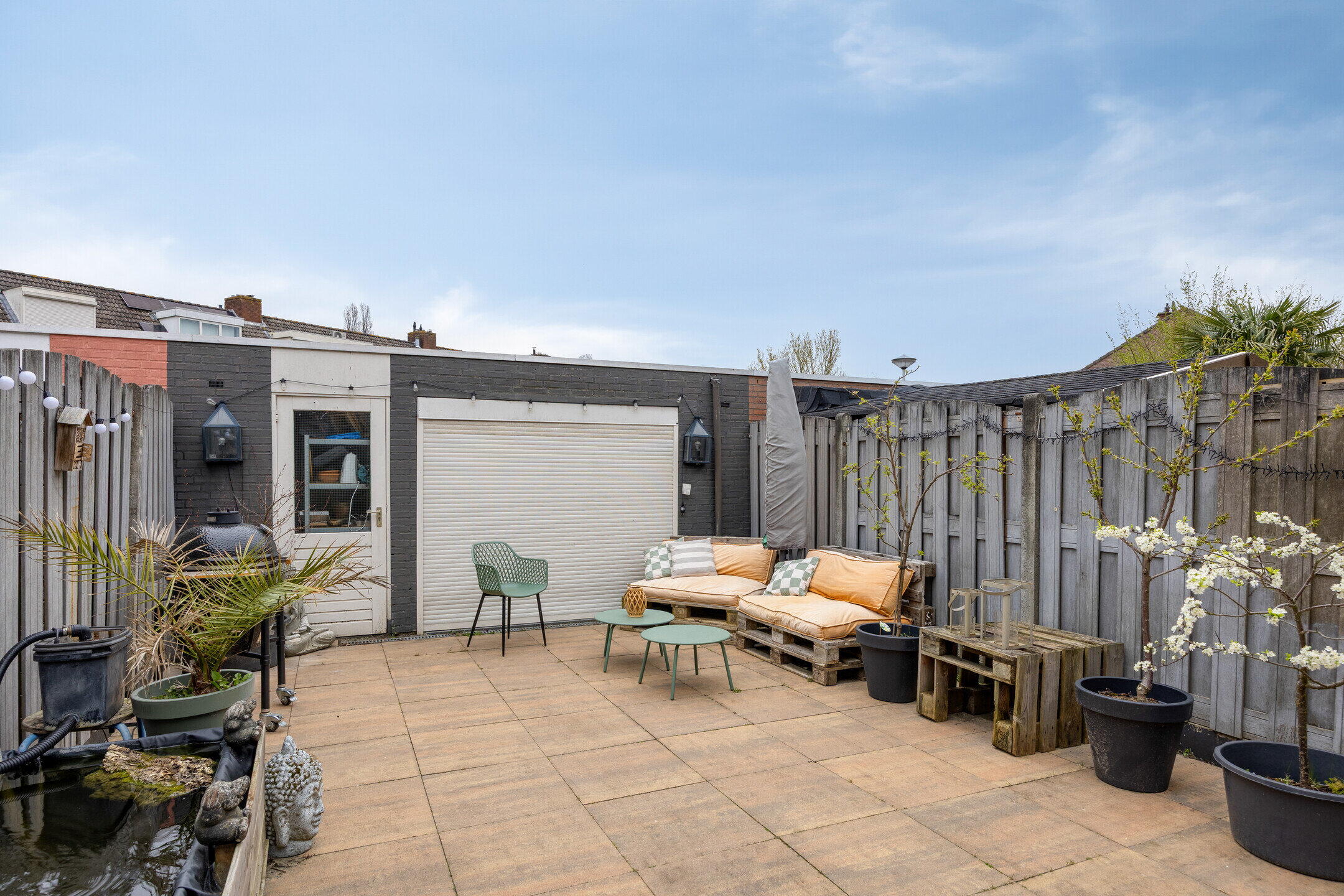 De achtertuin is volledig betegeld en daarmee onderhoudsvriendelijk aangelegd. Er is volop ruimte voor een comfortabele loungehoek of een gezellige buitentafel. Achterin de tuin bevindt zich een stenen berging en een handige achterom.